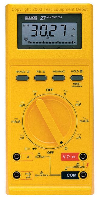 The Fluke 27 combines accurate digital and analog measurement capability with extreme ruggedness and durability. They have cases twice as thick as any other DMM we build. They are totally sealed, waterproof to 3 feet (one meter) of water for one hour, tough enough to withstand contaminants, chemicals, accidental drops and severe electrical overloads.